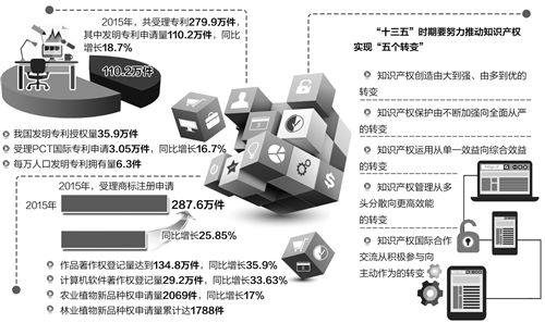 申长雨透露,国家已明确将知识产权“十三五”规划纳入国家“十三五”重点专项规划之中,“十三五”期间,我国知识产权事业发展将重点立足知识产权保护和运用两方面,研究出台一批知识产权重大政策、重大工程、重大项目,努力推动知识产权保护由不断加强向全面从严转变。